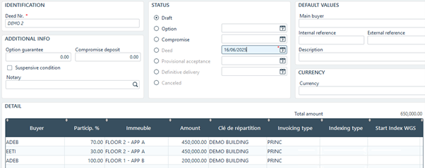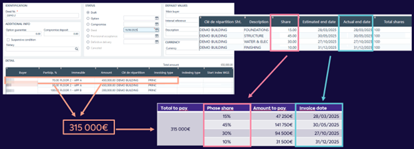 - the date of the deed, to ensure invoicing complies with the Breyne Law or, for already completed phases, invoicing via the notary (separate workflows).