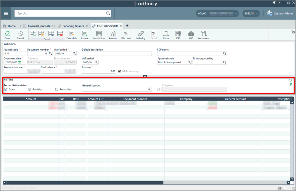 Vous avez la possibilité de filtrer sur le statut de lettrage, le compte général ainsi que sur la société directement depuis l'écran d'encodage des financiers.