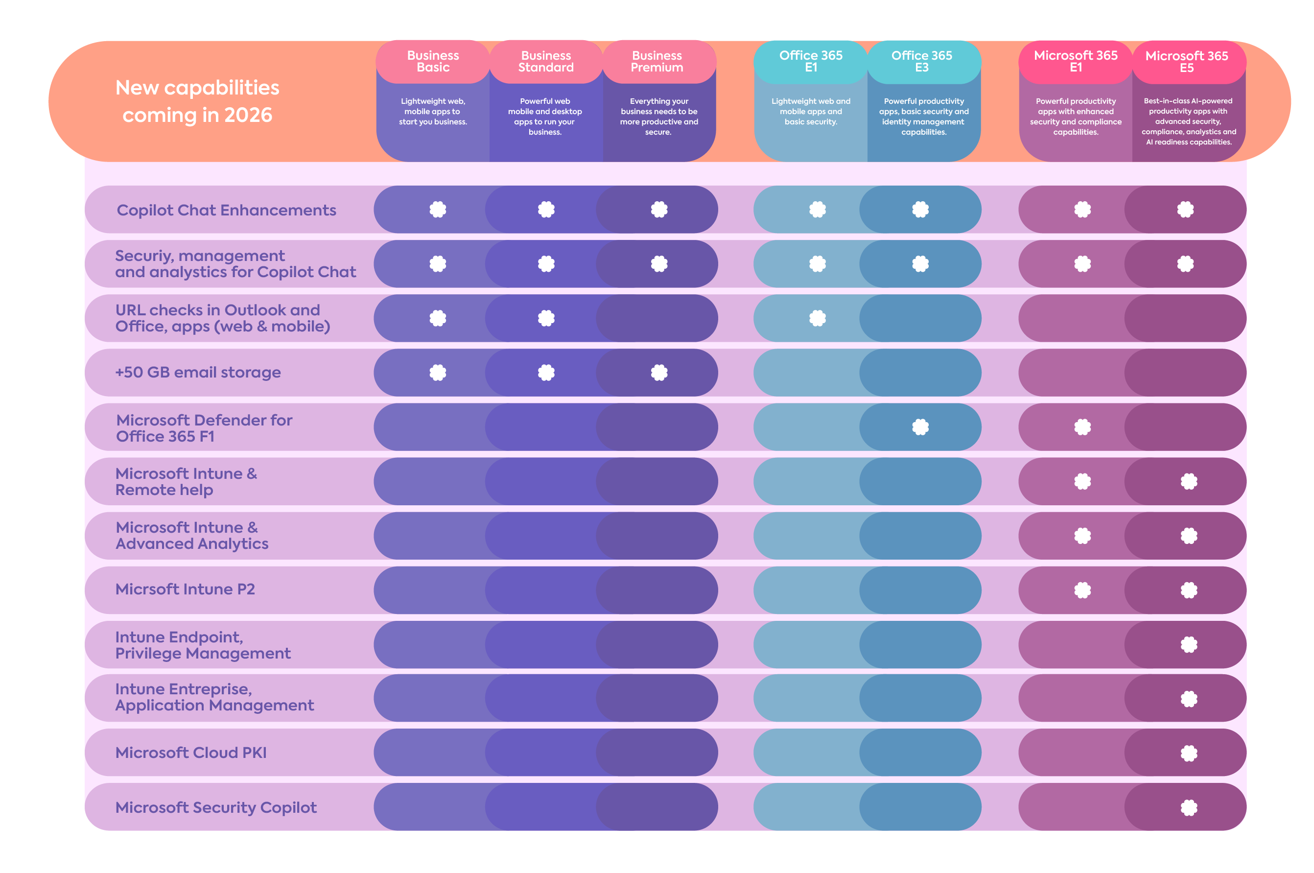 À partir de 2026, Microsoft ajoute des fonctionnalités supplémentaires en matière d’IA, de sécurité et de gestion à plusieurs licences Microsoft 365.