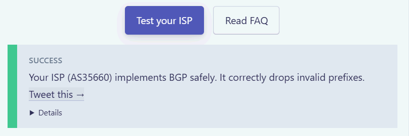 Vous pouvez vérifier si votre fournisseur d’accès à Internet a mis en place une configuration BGP sécurisée pour protéger votre réseau via : https://isbgpsafeyet.com.