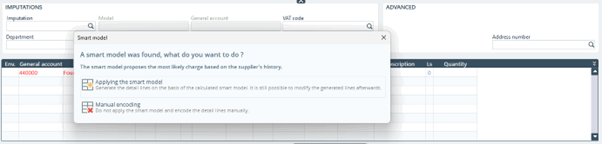 In het scherm voor boekhoudkundige codering, bij het aanmaken van een nieuw boekhoudkundig document, kan de gebruiker, als er een slim model voor de leverancier wordt gevonden, ervoor kiezen dit toe te passen op het document, wat zorgt voor een betere transparantie. Ter herinnering, een slim model is een voorspellend model dat gebaseerd is op de geschiedenis van de toewijzingen van facturen van een bepaalde leverancier. Door de eerdere toewijzingen te analyseren, kan het de meest waarschijnlijke toewijzingen voor nieuwe inkomende facturen voorstellen.